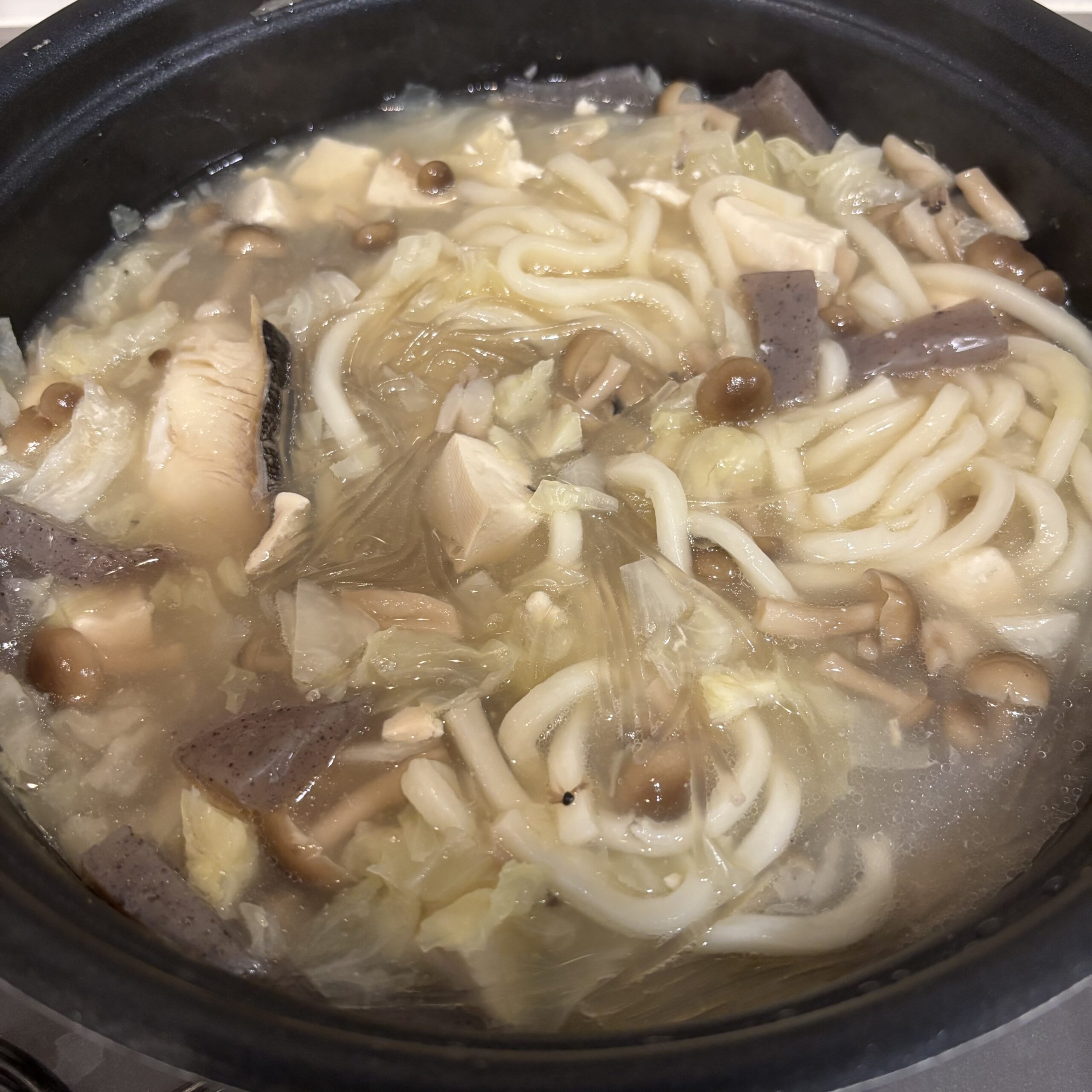 ブリ、たら、しめじ、キャベツ、こんにゃく、豆腐、うどん、春雨
