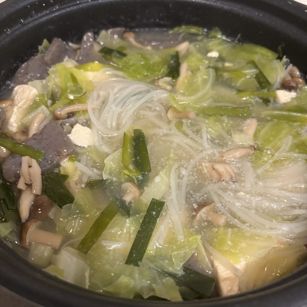 真だら、しめじ、キャベツ、ニラ、こんにゃく、豆腐、春雨
