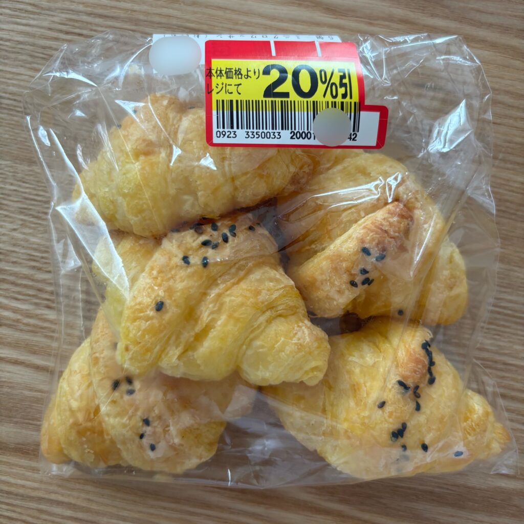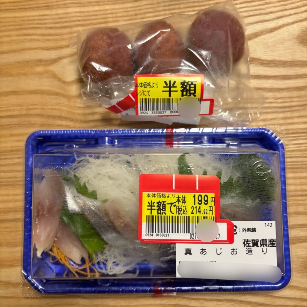 2人:味覇スープの残り、真あじお造り(半額)、さつまいもクロワッサン(2割引)×2、おさつボール(半額)×3