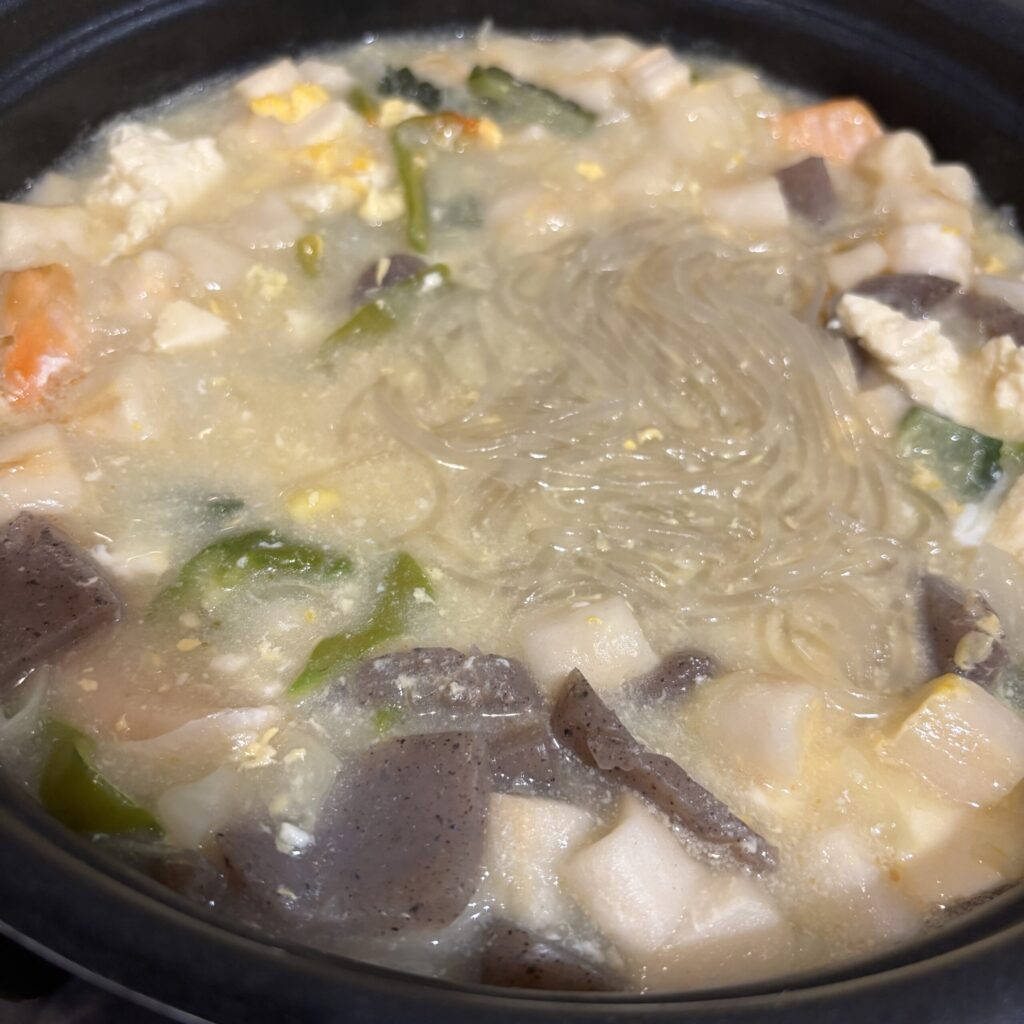 鮭、こんにゃく、キャベツ、ピーマン、ゴーヤ、豆腐、お麩、春雨、生卵2個