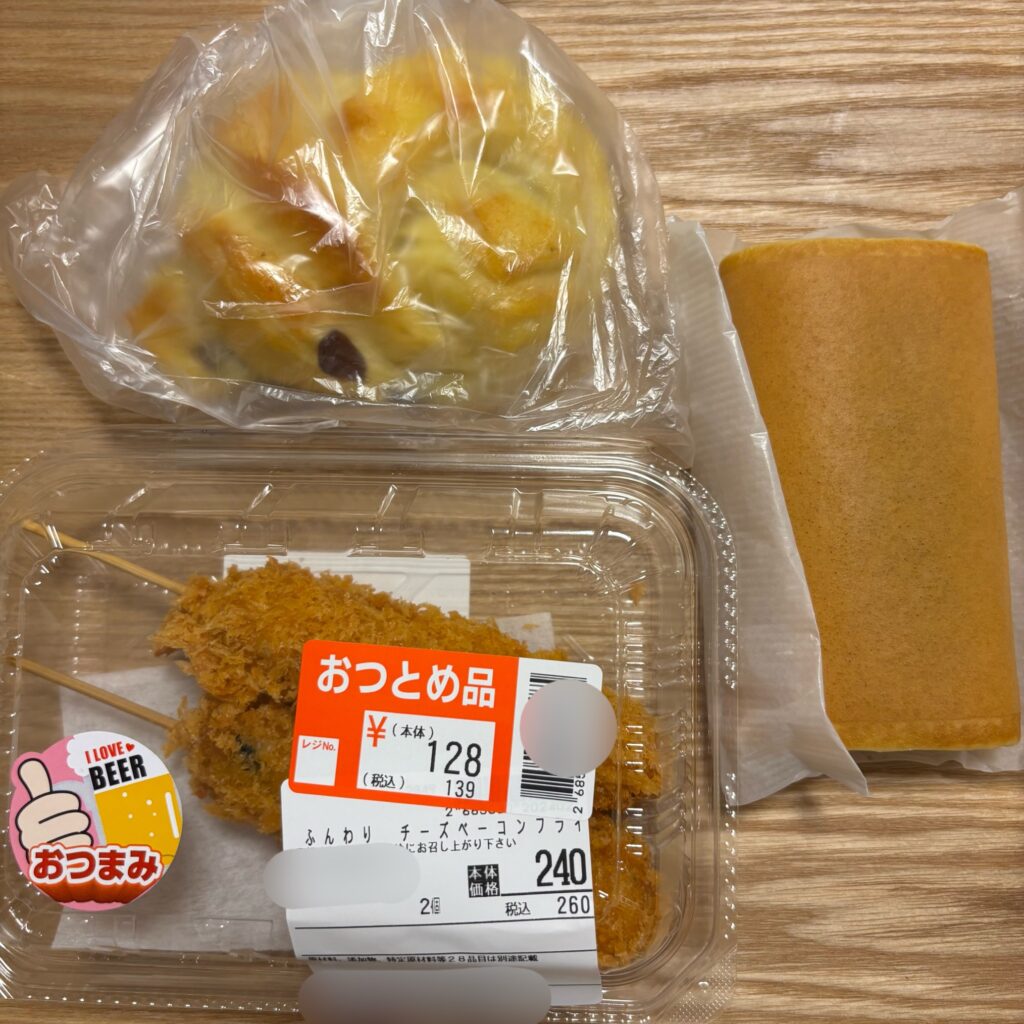2人:たまごスープの残り、チーズベーコンフライ、パン、大あんまき(カスタード味)