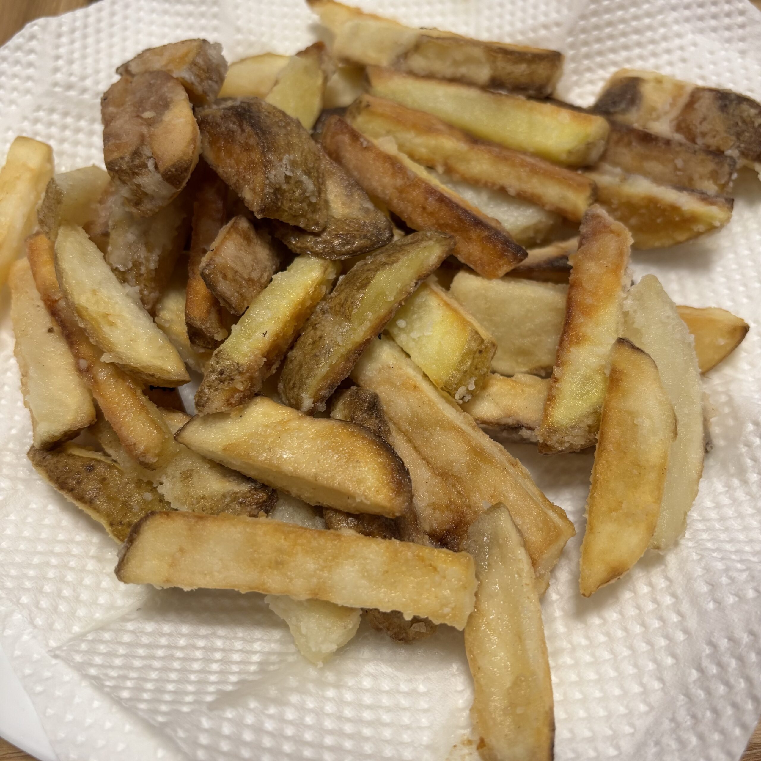 サイコロステーキをつくったらたくさん油が出たので、捨てるのはもったいないと思って揚げないポテトも作っちゃいました