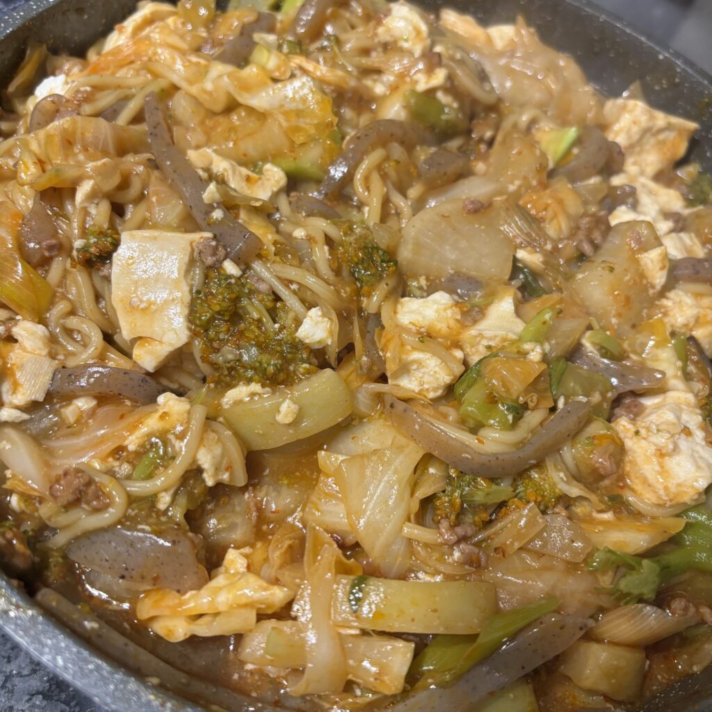 ミンチ、にんにく2かけ、キャベツ、ネギ、ブロッコリー、大根、こんにゃく、豆腐、焼きそば麺2