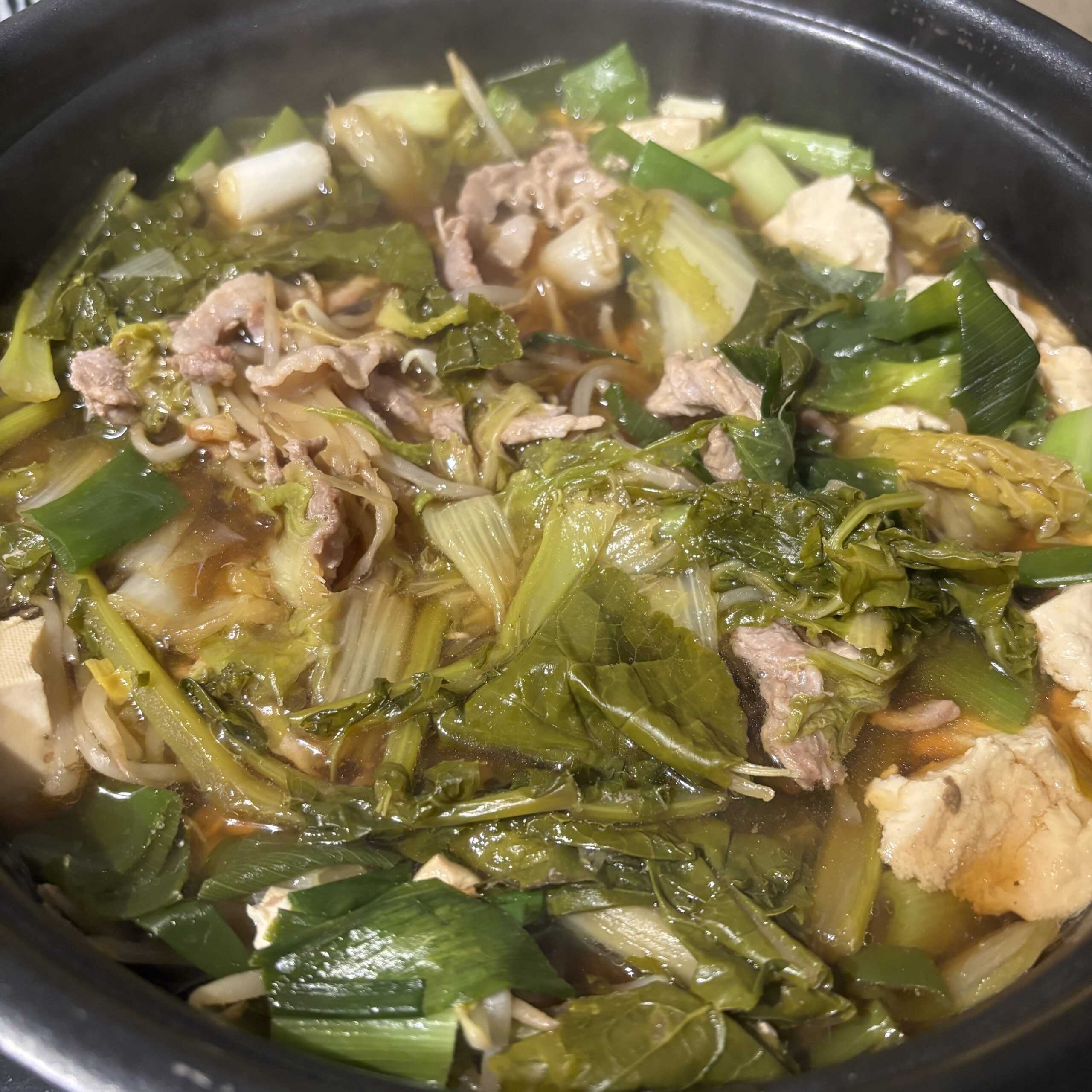 豚肉、白菜、ネギ、大根の葉っぱ、もやし、豆腐