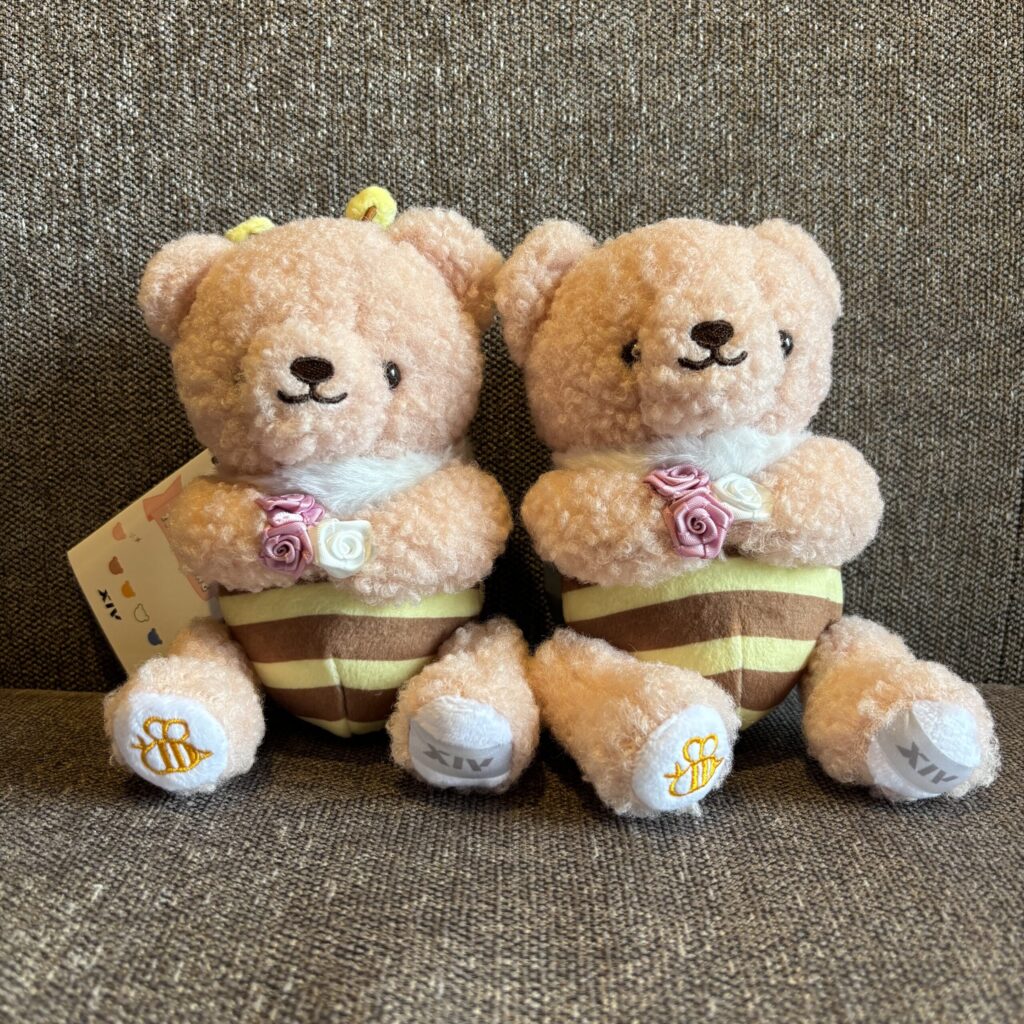 机の上に置いてある白い袋の中には、エクシブメイツコレクションプランでもらえたピンクのベアが入っていました