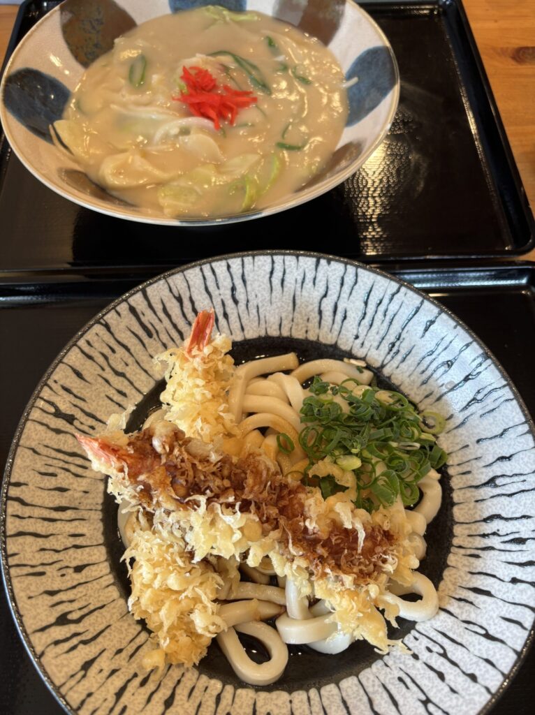 あんかけ焼きそば(上)、天ぷら伊勢うどん(下)